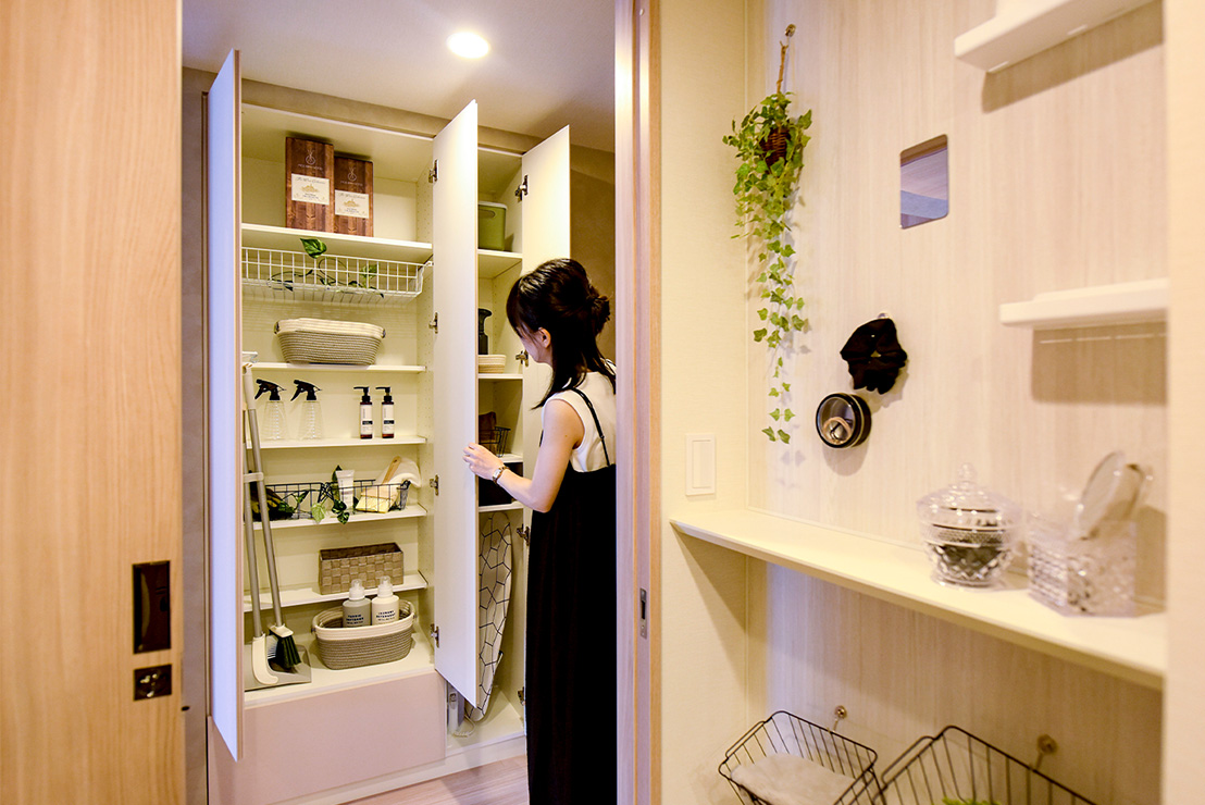 専有部にも気に入られたところが沢山あるそうです。「いちばん楽しみなのはキッチン。最近上の子がお手伝いをしたがるので、この広さなら一緒にお料理ができます。三口コンロや大きなシンクも使い勝手が良さそうです。」と奥様。ご主人は機能的な収納や間仕切りに感心されたと言います。「各居室や廊下、洗面室など室内の各所に、使い方に合わせてアレンジできる汎用性の高い収納があります。手が届く高さの吊り戸も、気が利いていますね。リビングに隣接する洋室の可動間仕切りも、開け放して大空間にしたり、閉めて個室にしたり、子供たちの成長に合わせて使い方を変えられるので便利です。」そのほか、広いバルコニーや大きなお風呂も気に入られたそうです。