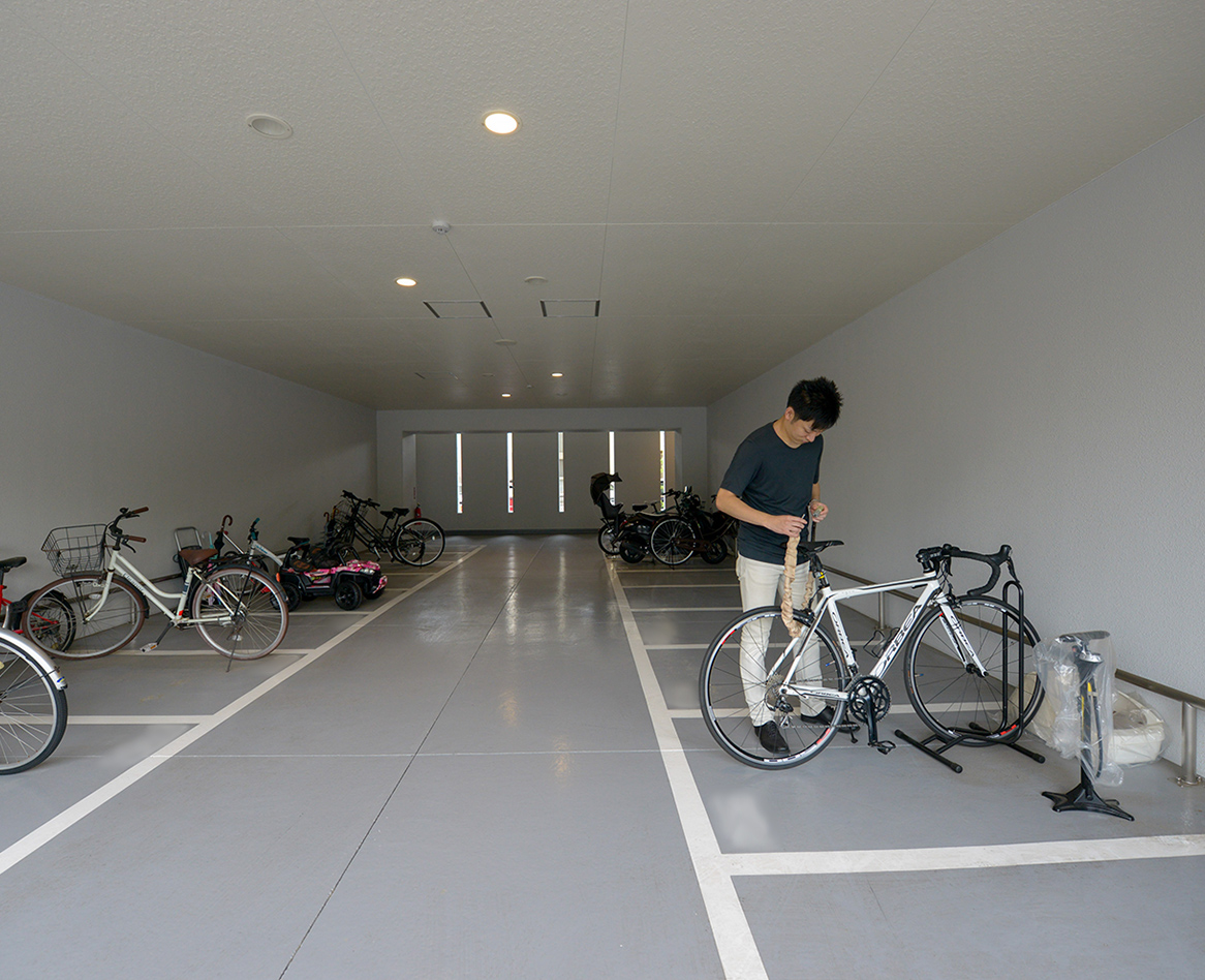 特に魅力を感じたのは、全戸分の「平面駐車場」と「無料サイクルポート」が完備されていることだったそうです。「平面駐車場の利用料が安い点もいいですね。サイクルポートは広々としていて、複数台の自転車やタイヤなどを置いておくこともできます。さらに、サイクルポートと同じ屋内にバイク置き場もあります。」実は、ハーレーダビッドソンの大型バイクを所有し、大切にされているご主人。「ロックできる屋内なので、盗難やいたずらの心配もありません。こういう共有部がここまで充実したマンションは、なかなかないですね。その他共有部では、『宅配ボックス』や、雨にぬれず24時間ゴミ出しができる『ゴミ置き場』が便利だと感じています。」