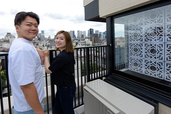 洗面化粧台にも、ぜひ参考にしたい飾り付けが。「三面鏡下の壁面がマグネット対応だったので、マグネット式のタイルを貼っています。」専有部を取り囲むように配置された広いバルコニーのグリーンコーディネートも素敵。室内からも見える清々しい緑に心が癒され、都会の真ん中にいることを忘れてしまいそうです。そんなご夫妻に高評価をいただいたのは、マンション共用部。「ロビーに飾られているアートフラワーが、入居して少ししたら変わりました。季節ごとにお花が変わるんですね。外構の夜間照明も綺麗ですし、ホテルのような内廊下も気に入っています。」しばし日常を離れて、優雅な気分に浸れるH邸でした。