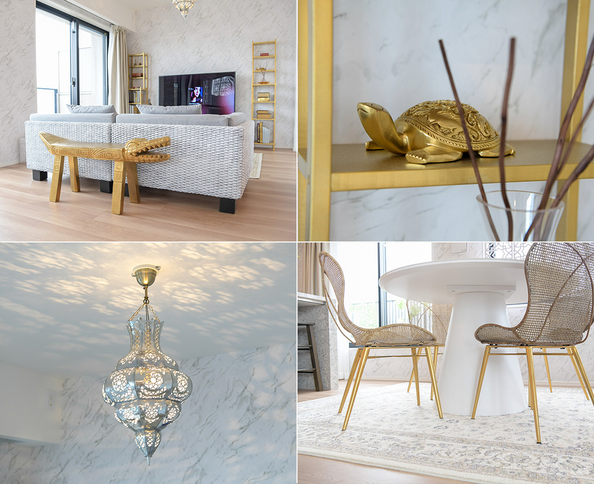 キッチンからリビング・ダイニングスペース、さらには家具や小物、照明器具に至るまで、統一感のあるインテリアで美しくコーディネートされているH邸。ご入居時に全て新調されたのかと思いましたが、「スプレー塗料を使って、自分たちで色を変更しました。」と驚きの発言が。「以前の部屋はアジアンテイストでまとめていたので、茶系のモノが多かったんです。そこで、ダイニングチェアの脚、ワニの長椅子、本棚、亀の置物などはゴールドに、ソファの枠組みは白に、茶系の木製部分を塗装し直してみました。」ご夫妻のセンスの良さもさることながら、プロ顔負けのDIY技術に、ただただ感心するばかりです。