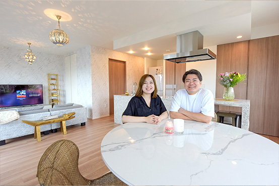 「アイランドキッチンはなかなかないので、一目で気に入りました。フィオレストーンの天板は高級感があって、お掃除も簡単。タッチレス水栓も便利です。」と奥様。ところでこのキッチン、普通のご家庭にあるものがないような。そう、キッチン家電が見当たりません。「実は、扉の中に。このキッチン収納は標準装備でした。ゴミ箱もカウンター下に収まるので邪魔にならず、見た目もすっきりして良いですね。ゴミ箱置き場のリビング側には椅子を置いています。ピッタリサイズのゴミ箱と椅子を探すのには苦労しましたが。」と笑うご主人。その甲斐あって、生活感のない見事なキッチンスペースに仕上がっています。