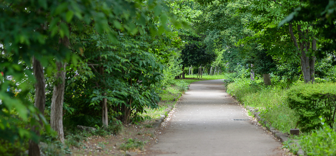 駅のすぐ左手に、木陰の遊歩道があります。ここは「玉川上水緑道」。そよぐ風が気持ちよく、賑やかな駅前から突然切り離されたように、静けさに包まれています。脇を走る車道には、アーチのような桜並木。満開の季節には、毎日訪れたくなりそうです。