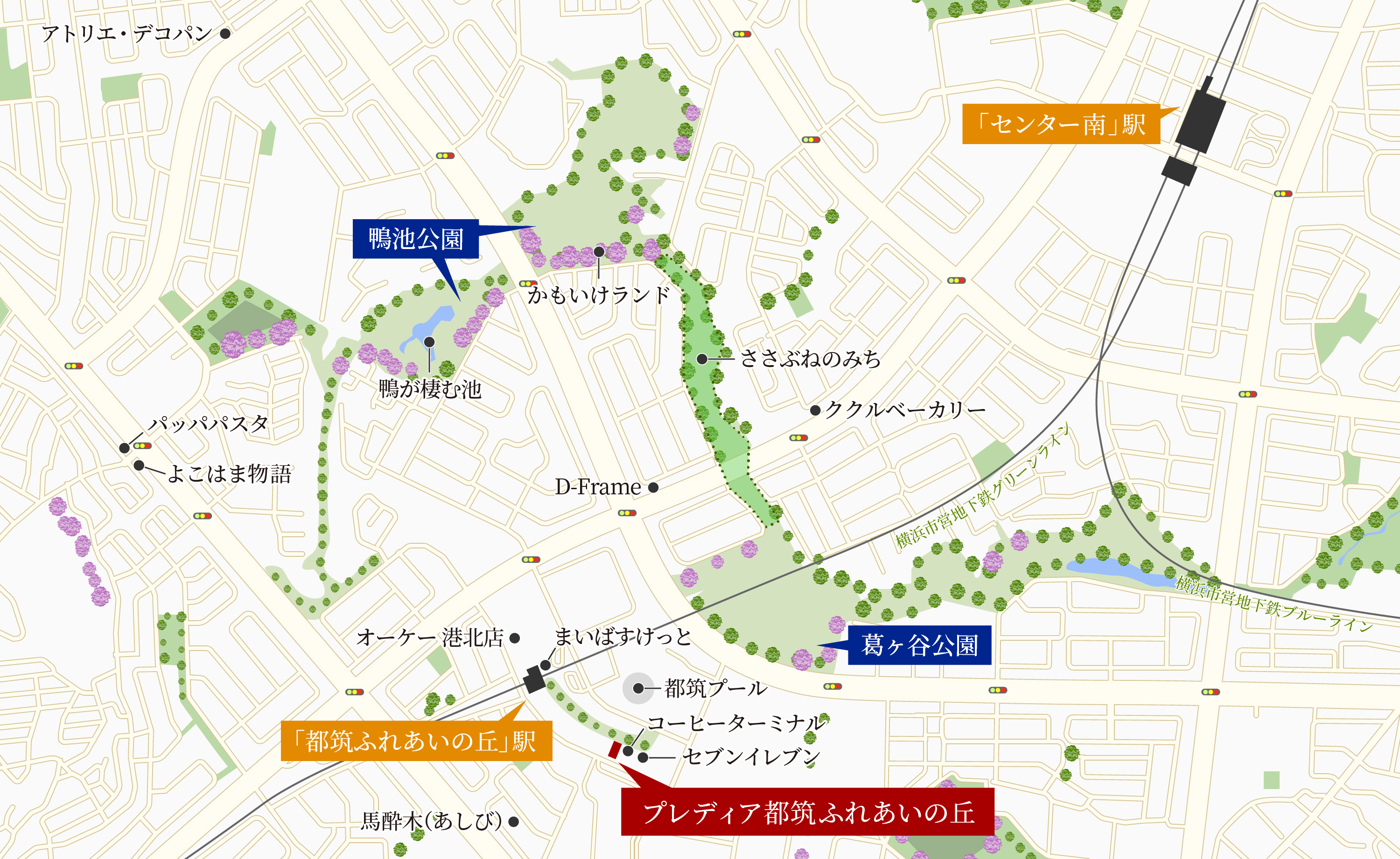 スタート地点は、横浜市営地下鉄グリーンラインの「都筑ふれあいの丘」駅。東京都心と横浜を通勤圏とするベッドタウンとして開発された「港北ニュータウン」の駅です。広々とした駅前広場には「オーケー」や「まいばすけっと」などのスーパー、コンビニ、ドラッグストア、各種医療クリニックなどが集結。暮らしに必要な施設が揃っています。