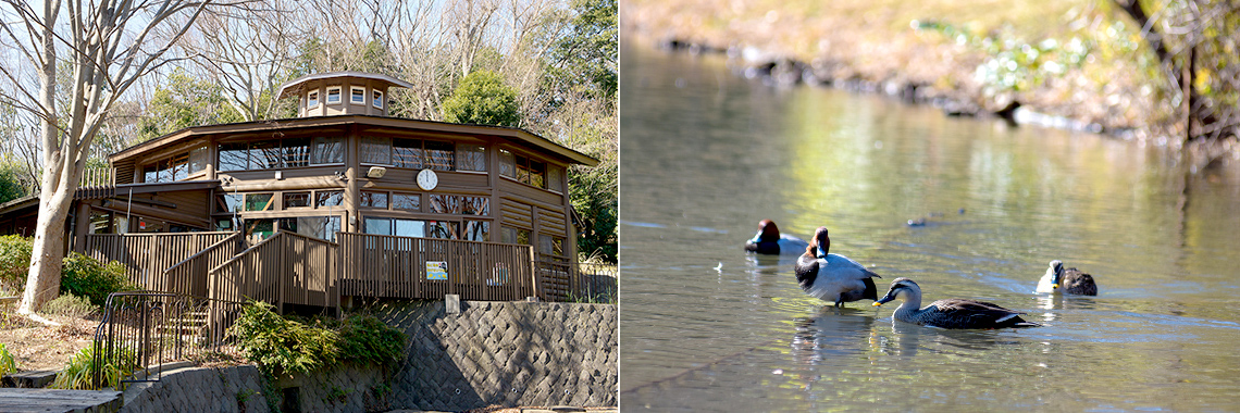 「鴨池公園」に着きました。その名の通り、鴨が棲む大きな池のある港北ニュータウン南西地区を代表する公園です。園内には子ども用のログハウス「かもいけランド」もあり、雨の日でもお子様を遊ばせることができます。ハウス内には、らせん形の滑り台や吊り橋風の遊具、地下迷路など、ワクワクするような楽しい仕掛けがいろいろあります。
