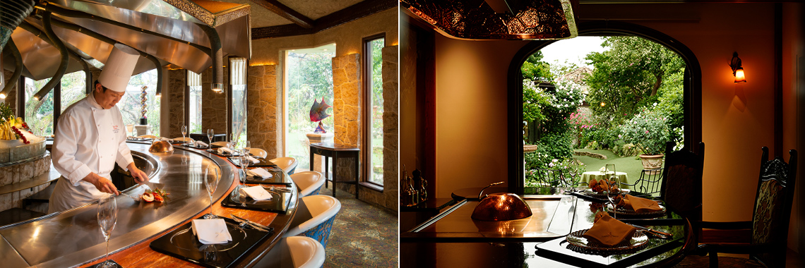 駅西側邸宅街の丘に佇む「あざみ野うかい亭」は「シェフズテーブルスタイル」の鉄板料理店。ダイナミックに料理を仕上げていく料理人の技に目を奪われながら、最上級の牛肉「うかい特選牛」と旬の味覚が堪能できます。和洋が融合した優美な室内空間と、四季折々の花や緑が溢れる「欧風庭園」。日常からしばし離れて至福のひと時が味わえます。