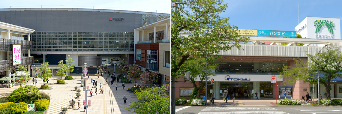 「あざみ野」駅の隣駅、「たまプラーザ」駅へ来てみました。「プレディアあざみ野」の最寄りバス停「荏田新道」からバスで9分。再開発で美しく整備された駅前広場を囲むように広がった大規模ショッピングモール「たまプラーザテラス」には、「東急百貨店」や様々なトレンドショップが軒を連ね、若い方から年配の方まで多くの人で賑わっています。