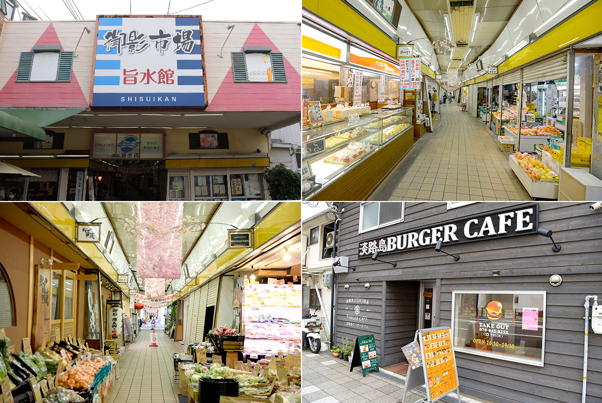 「匠」から少し足を伸ばして、阪神「御影」駅前の「御影市場 旨水館(しすいかん)」に来てみました。2020年に創業100周年を迎えたレトロ感溢れる高架下の商店街です。商店街散策中のひと休みには「淡路島バーガーカフェ」がおススメ。淡路産の玉ねぎをはじめ、淡路の豊かな自然が育んだ美味しさをギュッと詰め込んだご当地バーガーが味わえます。