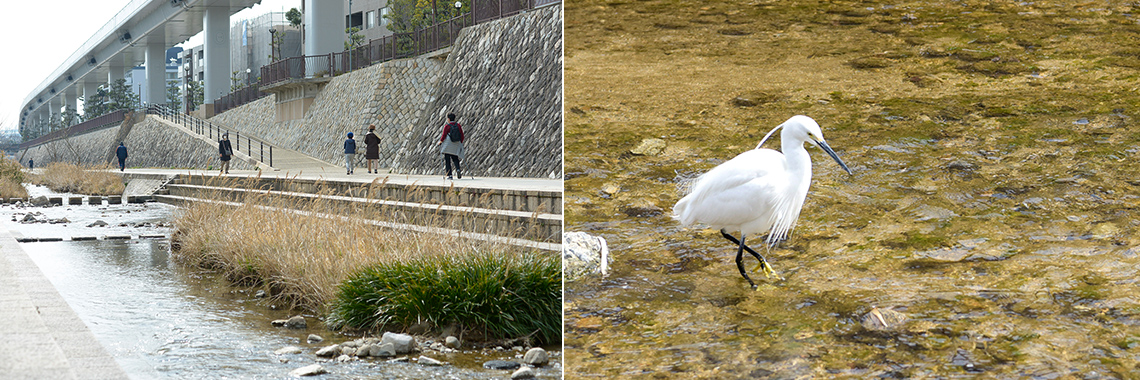 行政施設群の先に流れる「住吉川」は、生活排水のない市内随一の清流です。河川敷の遊歩道は片道約2.5km。川のせせらぎを–聞き、六甲の山並みや野鳥を眺めながら、ジョギングやウォーキングが楽しめます。夏には、川に住む生き物を調べたり、水遊びの工作などをする「親子水辺フェア」も開催。水がきれいな「住吉川」ならではイベントです。