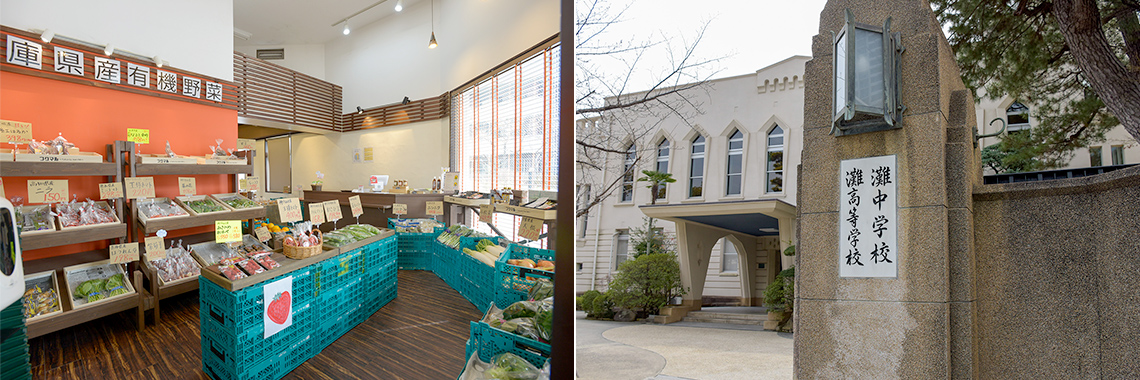 川沿いには「都市に残された水や緑などの貴重な自然環境を守る地域」に指定された「住吉川・赤塚山風致地区」が広がっています。この良好な環境の中、堂々と校舎を構えるのが「灘中学校・高等学校」。多くの東大生輩出で知られる国内有数の進学校です。川周辺には、地元で採れた野菜や果物を提供する「フクマル」など素敵なお店も沢山あります。