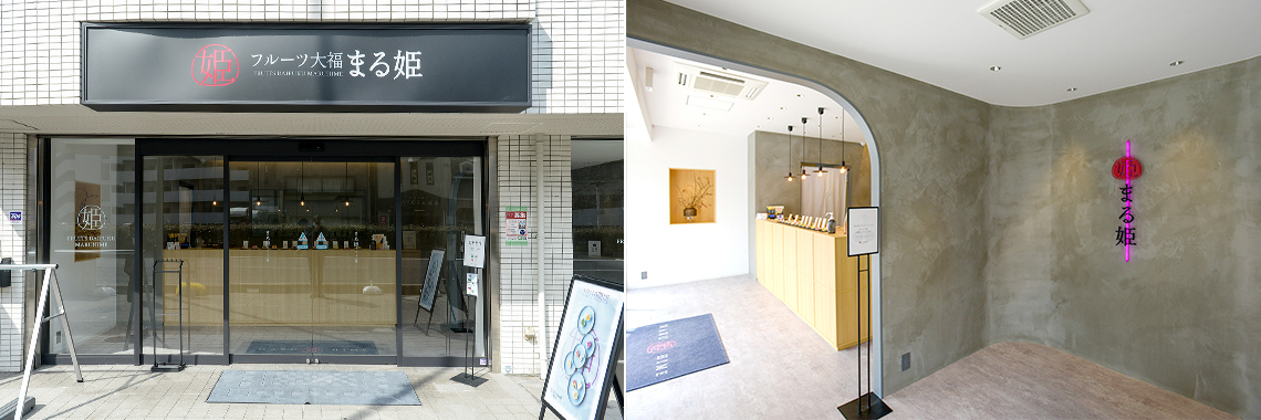 国道2号線沿いの「まる姫」はフルーツ大福の専門店。旬のフルーツの美味しさを最大限に生かすために、餅ではなく薄皮の求肥と、試作を重ねた自信作の白餡を使っています。「大きなフルーツ」と「薄く伸ばした白餡」を「薄い求肥」で包むのは、機械ではできないとても繊細な作業。熟練したスタッフが、毎朝早くからひとつひとつ手作りしています。