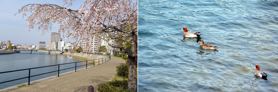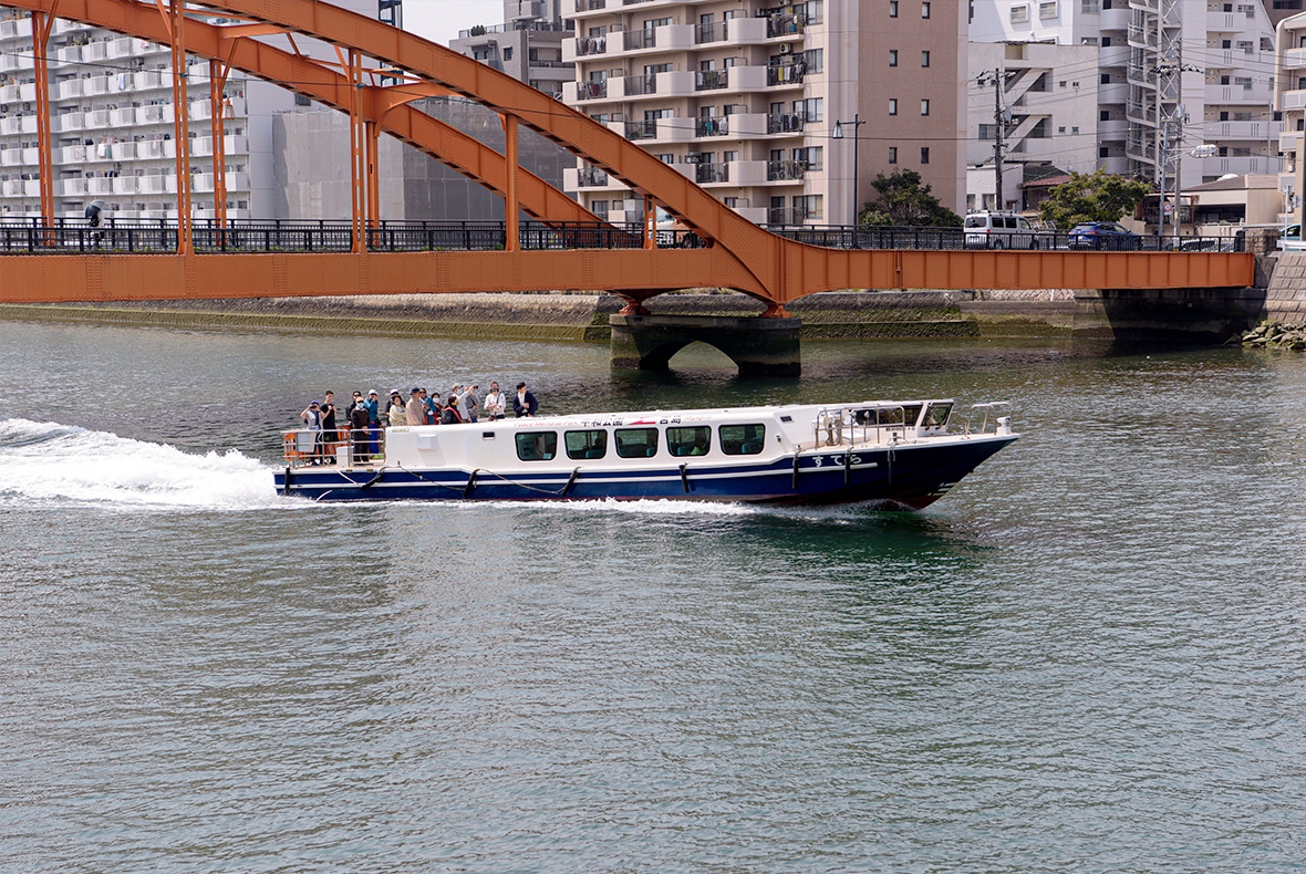 我が国初の鋼ローゼ橋(アーチを用いた橋)「住吉橋」の下を、平和記念公園と宮島を結ぶ「ひろしま世界遺産航路」の高速船や、「ひろしまリバークルーズ」の遊覧船が行き来する本川。宮島厳島神社の祭礼行事「管絃祭(かんげんさい)」の船も本川を巡航します。川沿いには学区の「広島市立 神崎小学校」も。創立100年を超える歴史ある小学校です。