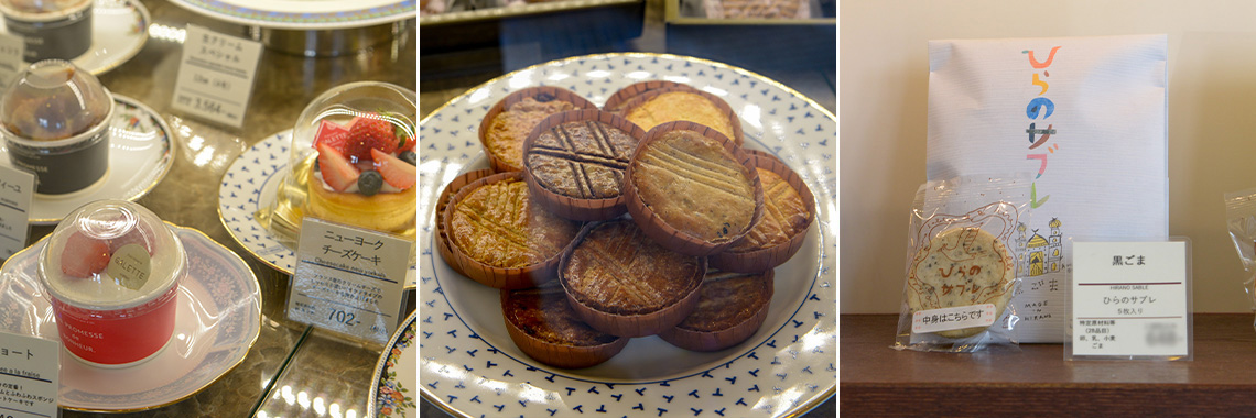 「パティシエ ツルハラ」の他にも、この辺りにはこだわりのケーキ・洋菓子店がたくさんあります。「パティスリーガレット」もその一つ。ケーキはもちろん、フランスの伝統菓子「ガレットブルトンヌ(厚焼きのバタークッキー)」や、「平野」みやげとしてぴったりの「ひらのサブレ」など、オリジナルな商品展開で人気です。デイリーなおやつから、誕生日やお祝い事、手土産など、暮らしのシーンに合わせて幅広く利用できます。