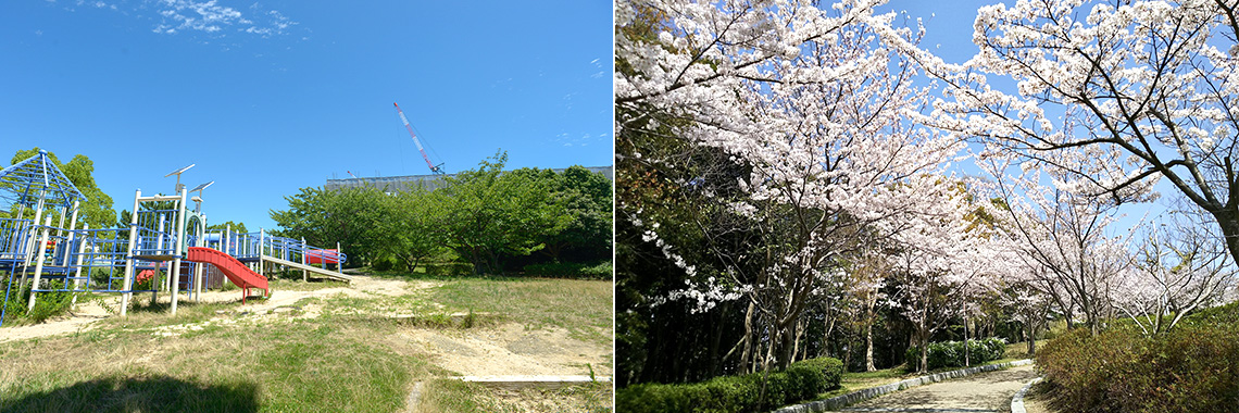 東に大阪湾、西に播磨灘、南に「明石海峡大橋」と淡路島。3方向に開放的な眺望を確保した「プレディア舞子レジデンス」では、見る度に表情が異なる雄大な景色と、庭感覚で利用できる2つの隣接公園が日々の暮らしを彩ります。西側は日時計のある「苔谷公園」、南側は遊具のある「舞子台南公園」。どちらの公園も桜が美しく、春にはお花見が楽しめます。