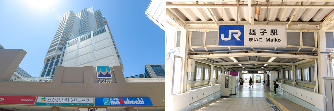 スタート地点はJR神戸線の快速停車駅「舞子」。山陽電鉄「舞子公園」駅も隣接し、2駅2路線の利用で都心はもとより市内各所へ快適にアクセスできます。どちらの駅にも直結する「Tio舞子」は、デイリーユースな店舗が集合した商業ビル。スーパー、ドラッグストア、書店、飲食店、郵便局、金融機関、医療機関など、暮らしに役立つ施設が揃っています。