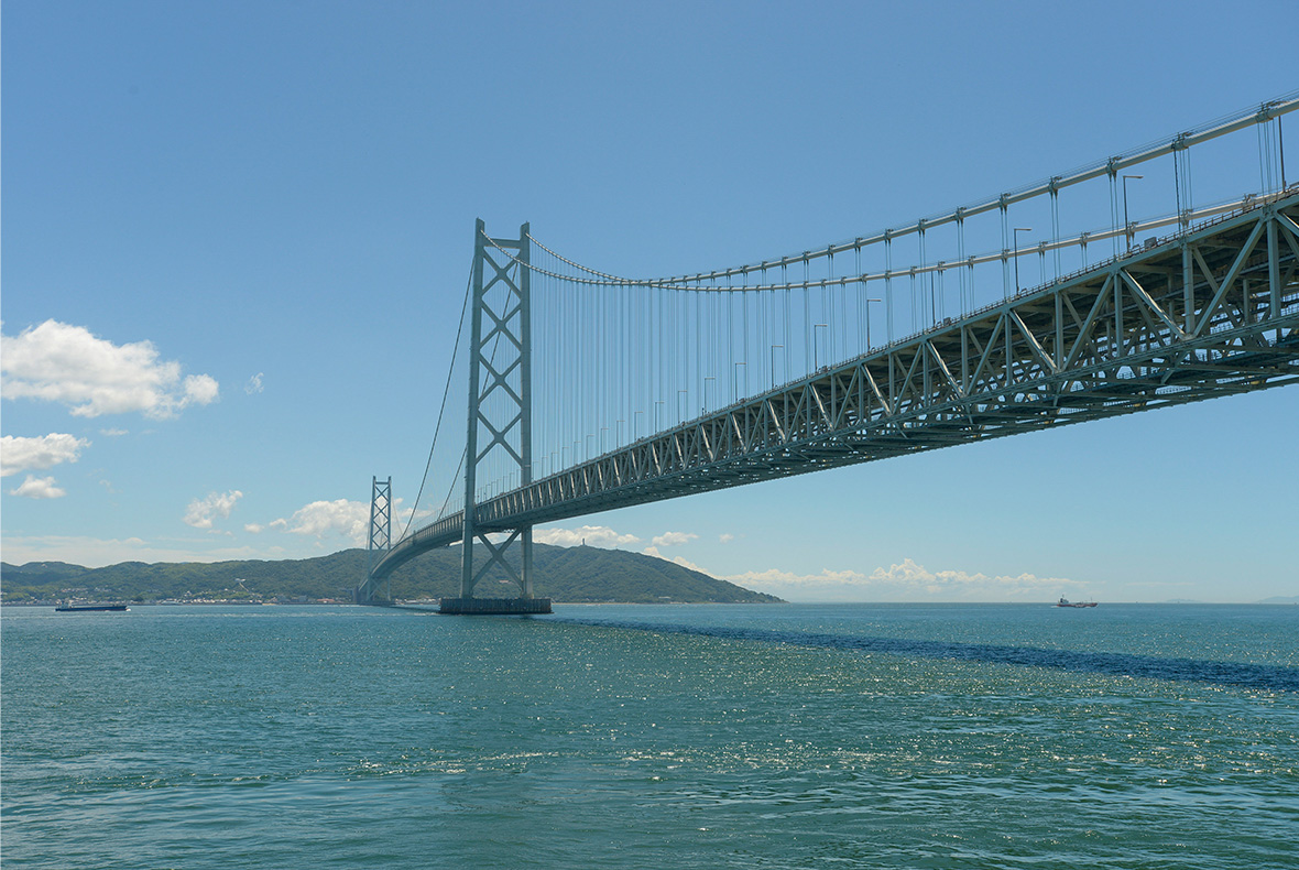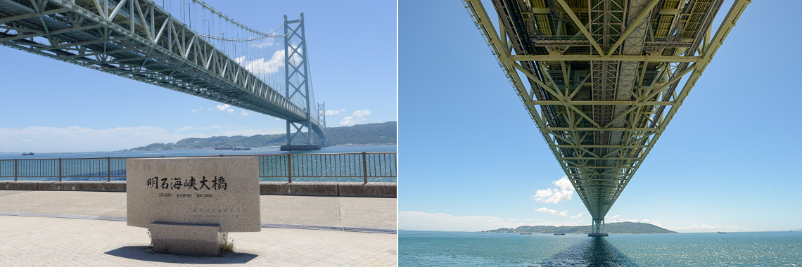 駅南側に広がるのは、広い空と瀬戸内海の大海原、そして「明石海峡大橋」と淡路島が奏でる大パノラマ。日本最長・世界最大級の吊り橋を目の前に、その圧倒的なスケール感と構造美を橋の下から見上げることもできます。宝石のようにキラキラ光る波間や、橋の下を行き交う船。壮観でありながら、心癒される海辺の景を日常の光景として愉しむことができます。