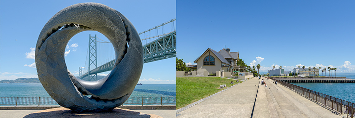 駅周辺から海沿いに広がる「県立舞子公園」は、明治33年に初の県立都市公園として開園した歴史ある公園です。広大な園内には、白砂青松として多くの詩歌に詠まれた古来舞子浜の風景を継承した「松林」や、メビウスの輪の中から「明石海峡大橋」を眺めることができる架橋5周年の記念碑「夢レンズ」など、この街を象徴する観光スポットが沢山あります。