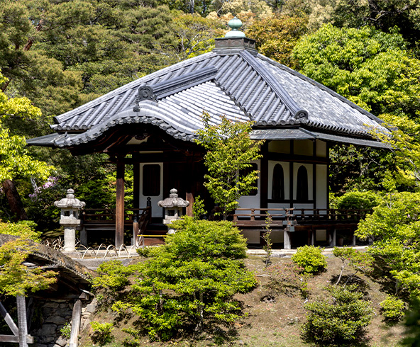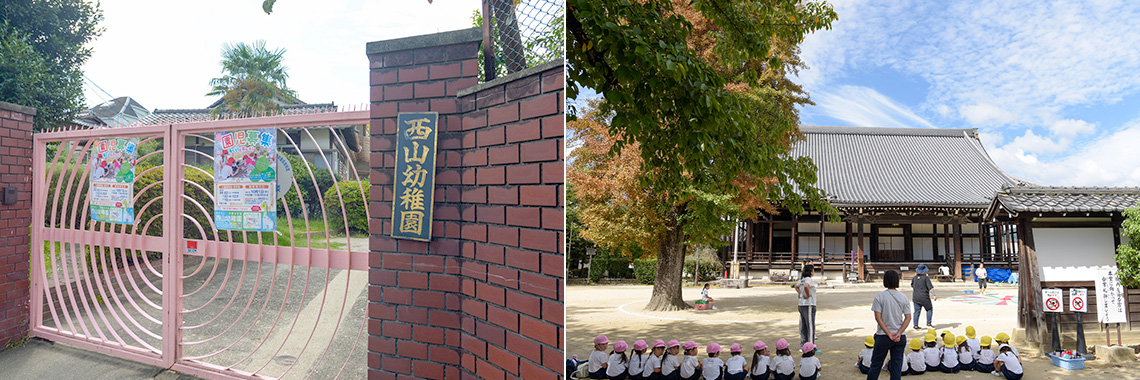 142号線沿いの「本願寺西山別院」は平安時代に創建された「久遠寺」を前身とする由緒あるお寺です。境内には「お坊さんの幼稚園」として親しまれる「西山幼稚園」が併設され、仏教の教えを身近に感じることができる茶道、書道、ヨガの教室も開催。フードドライブ(食品寄付活動)などのイベント活動も盛んで、仏教を通じた地域交流の場となっています。