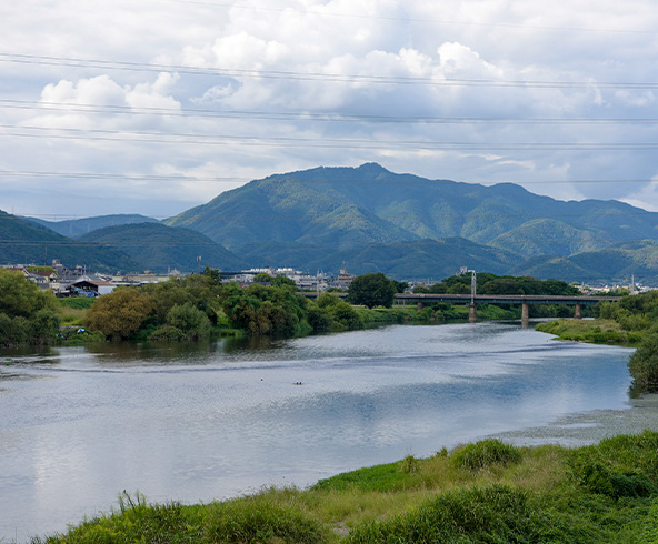 「桂離宮」の東側は、壮麗な山々を背景にした「桂川」の悠々たる流れ。豊かな自然の中、河川敷のグランドやサイクリングロードでスポーツに親しむこともできます。「桂離宮」が面する142号線は、旧山陰街道の道筋を受け継ぐ府道。道沿いには「京都六地蔵めぐり」の第三番札所として知られる「桂地蔵寺」など歴史的スポットが点在し、散策が楽しめます。