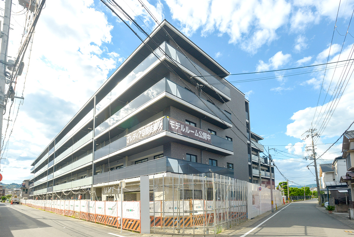 「桂」駅徒歩11分の場所に建設中の「プレディア京都桂御所」は、全108邸の大規模低層レジデンスです。「桂」駅を最寄りとする大規模分譲マンションの供給は約10年ぶり。周辺は閑静な住環境の「第一種中高層住居専用地域」で、すぐ北側は診療科数20科の総合病院「三菱京都病院」。24時間営業のスーパー「フレスコ上桂店」も徒歩6分です。