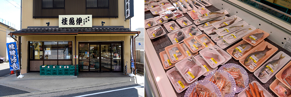 「石焼き生パスタ蔵之助」から142号線を東へ。「桂魚伊」は昭和38年創業の老舗の魚屋さんです。魚のプロが厳選した新鮮な魚を低価格で提供するほか、魚料理に合う野菜や調味料、お寿司や海苔巻き、調理済みのお料理などを豊富に販売。西京区内のご家庭には、電話1本で1商品から配達してくれるので、ご高齢の方や子育て中の方にも喜ばれています。