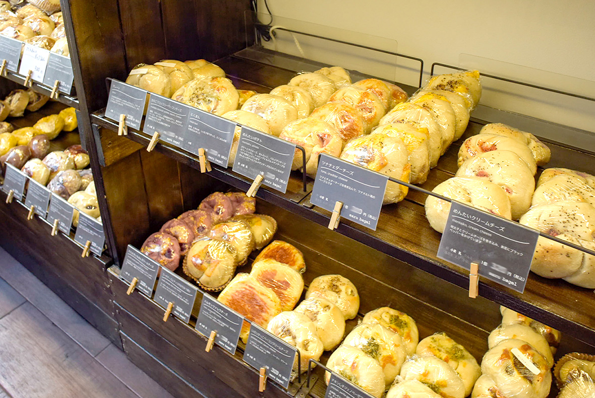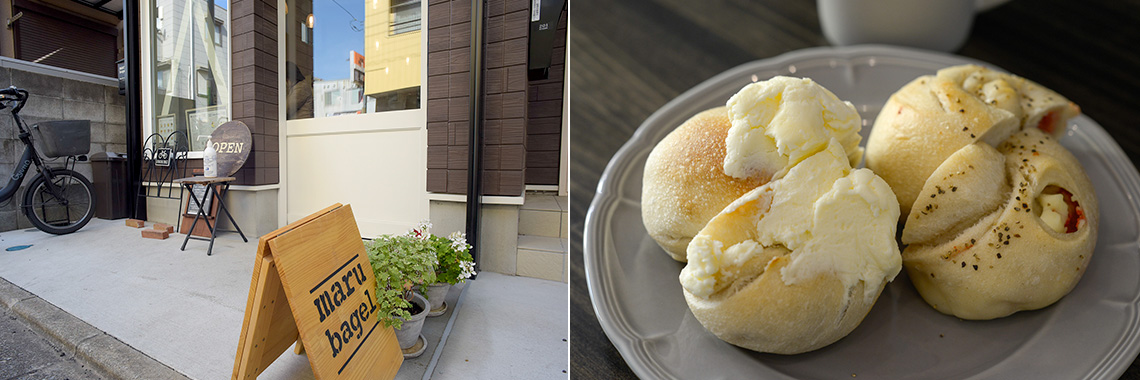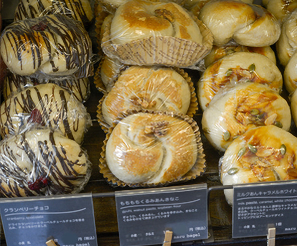 「トラットリア アクア」のすぐ近くには、自家製酵母と国産小麦を使用したこだわりのベーグルを提供する「マル ベーグル」があります。焦キャラメルスイートポテトあん、もちもちくるみあんきなこなど、独創的なベーグルが種類豊富に揃い、開店前からお客様が並ぶ人気店です。カフェスペースもあるので、でき立てのベーグルをその場で味わうこともできます。