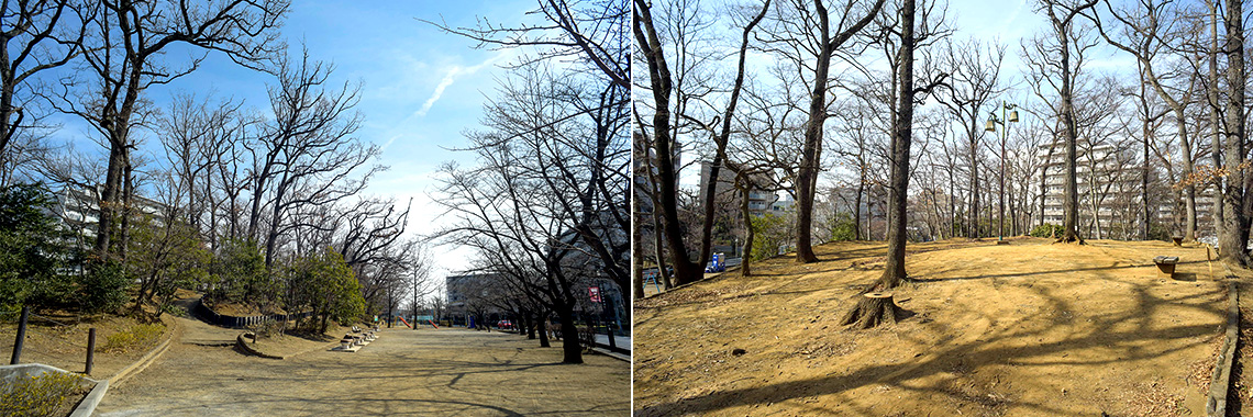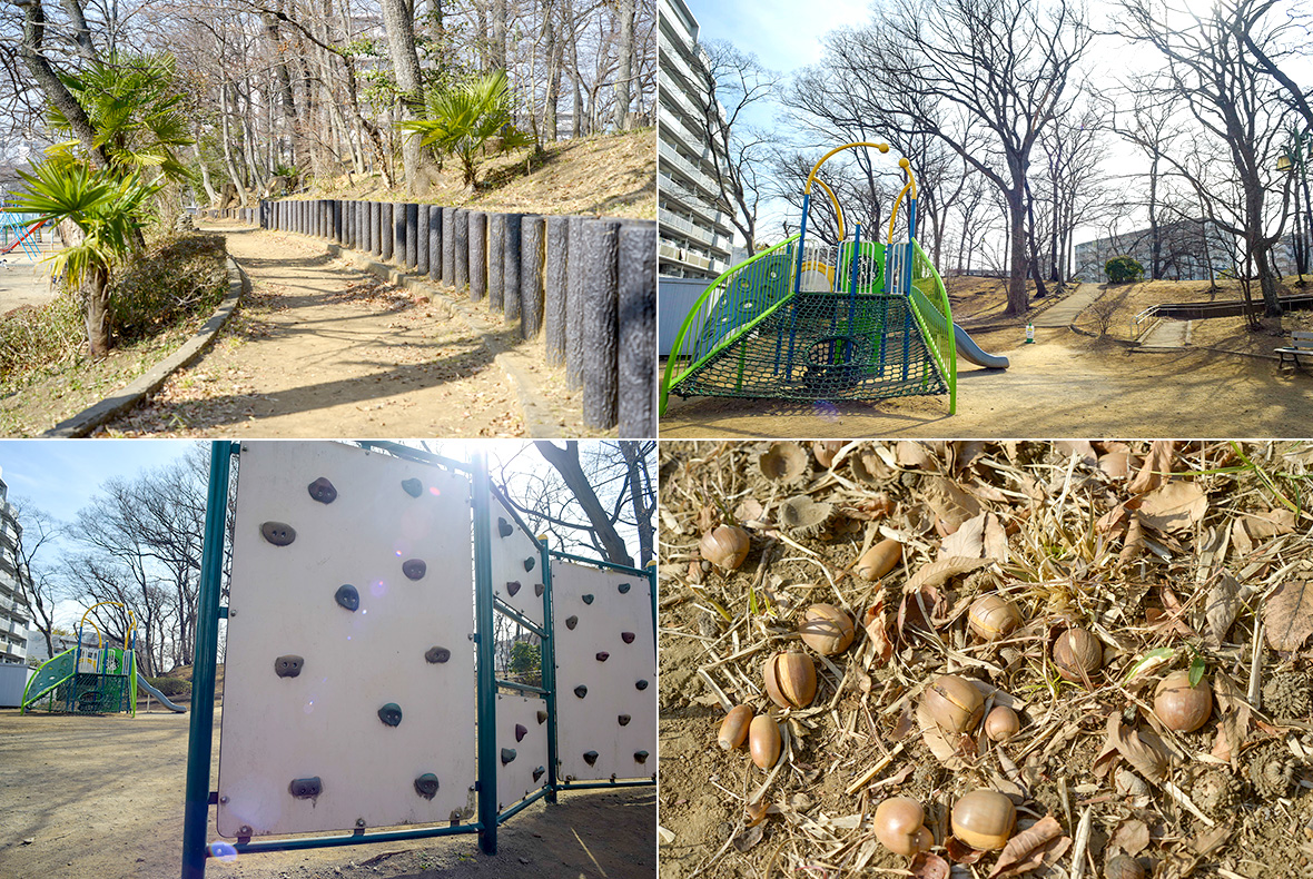 現地南西側に広がる「舟山公園」には小高い丘と雑木林があり、森のような雰囲気が楽しめます。遊具も豊富で、他の公園ではなかなか見られないボルダリング壁も設置されています。丘の傾斜はきつすぎないため、ウォーキングなどの軽い運動にも最適。雑木林の中の散歩道でどんぐりを拾ったり、四季折々の彩りを楽しみながら園内を散策するのもおススメです。