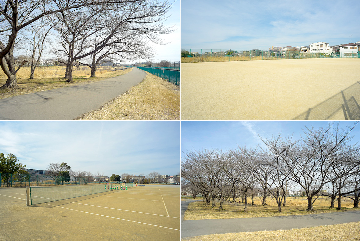 現地北東側の「川口市上谷沼運動広場」は、川口市とさいたま市の市境にある約1.5kmのウォーキング・ランニングコースや、テニス・サッカーコート、多目的グラウンドなどを備えた広大な運動広場です。桜の名所でもあり、春には桜を眺めながらの「お花見ランニング」を楽しんだり、野鳥観察やザリガニ採りをして、親子で自然に親しむこともできます。